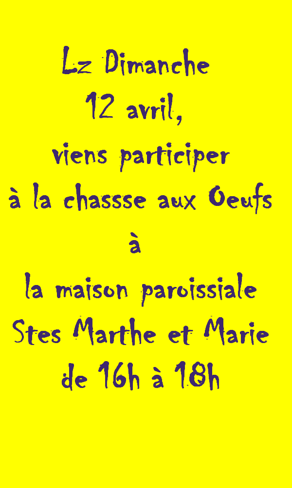 Dans le cadre des « Après midi Famille » le dimanche 12 avril est organisée une chasse aux dans le jardin de la maison paroissiale Saintes Marthe et Marie, 13 rue des prisonniers à St Sébastien.