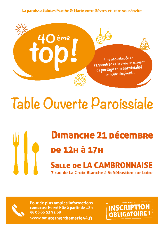 la prochaine TOP aura lieu le 21 décembre de 12 h à 17 h à la salle de LA CAMBRONNAISE.
